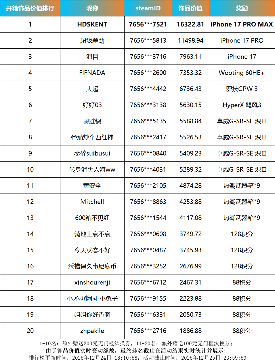 三、排名将以排行榜形式在上方表格公布前20名,排行榜更新时间为每日10:00/14:00/18:00,由于饰品价值实时变动缘故,最终排名截止在活动结束实时统计并展示;